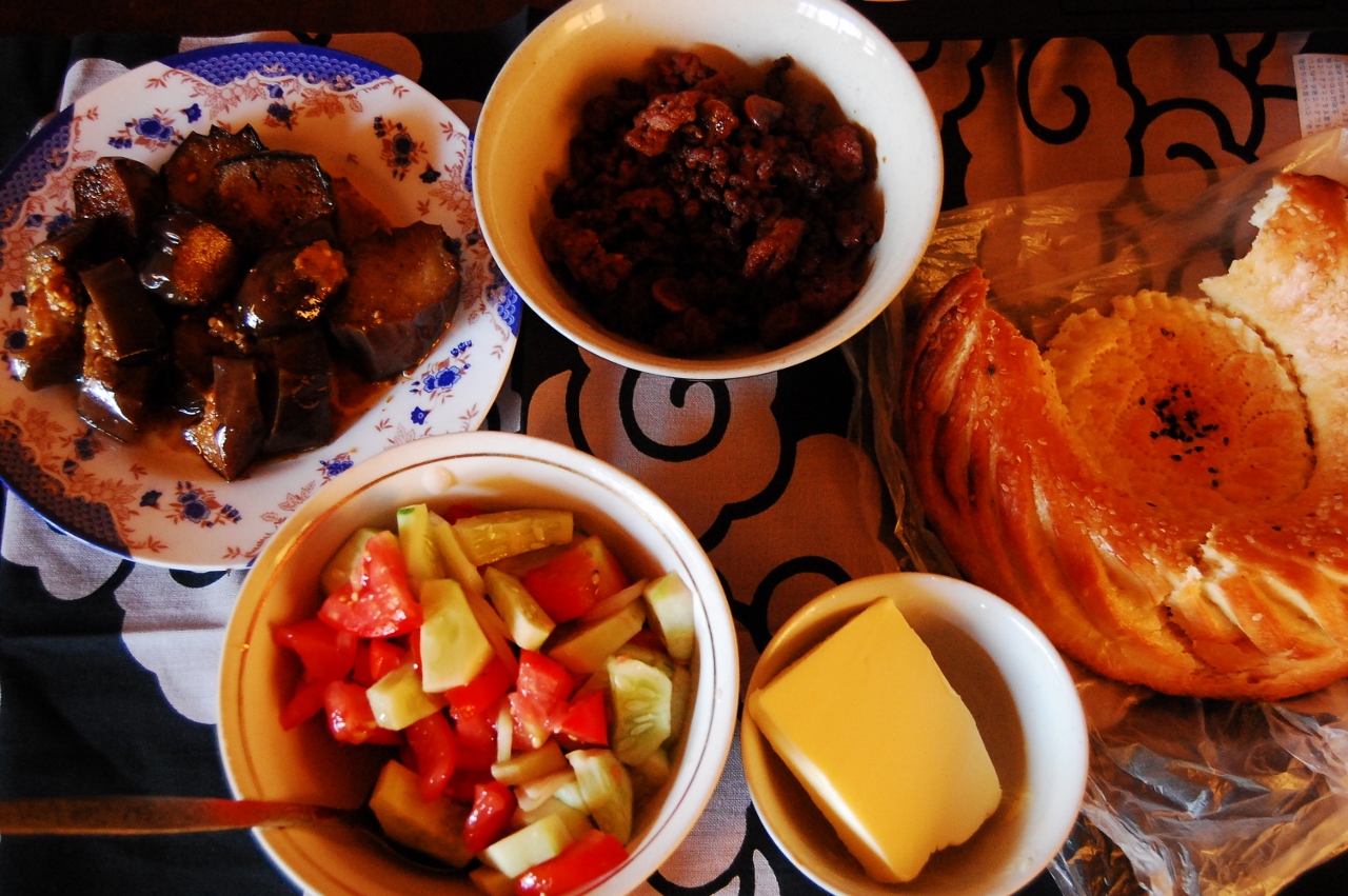 さて、先日、バザールで苦労して香辛料類を買ってきたので、今日は茄子のサブジ(野菜カレー)を作ってみることに。ちなみに、サブジとはウズベク語では人参のことだし、ブータンでは市場のことなんだって。たっぷりの油でクミンを熱して、クミン+コリアンダー+チリのパウダーを炒めてから、ぶつ切りの茄子を蒸し煮しただけのカレー。それに挽肉の醤油焼きを添えて、食べました。先日スーパーで少し高いバターを買ったので、主食のパン(ノン)もおいしい。