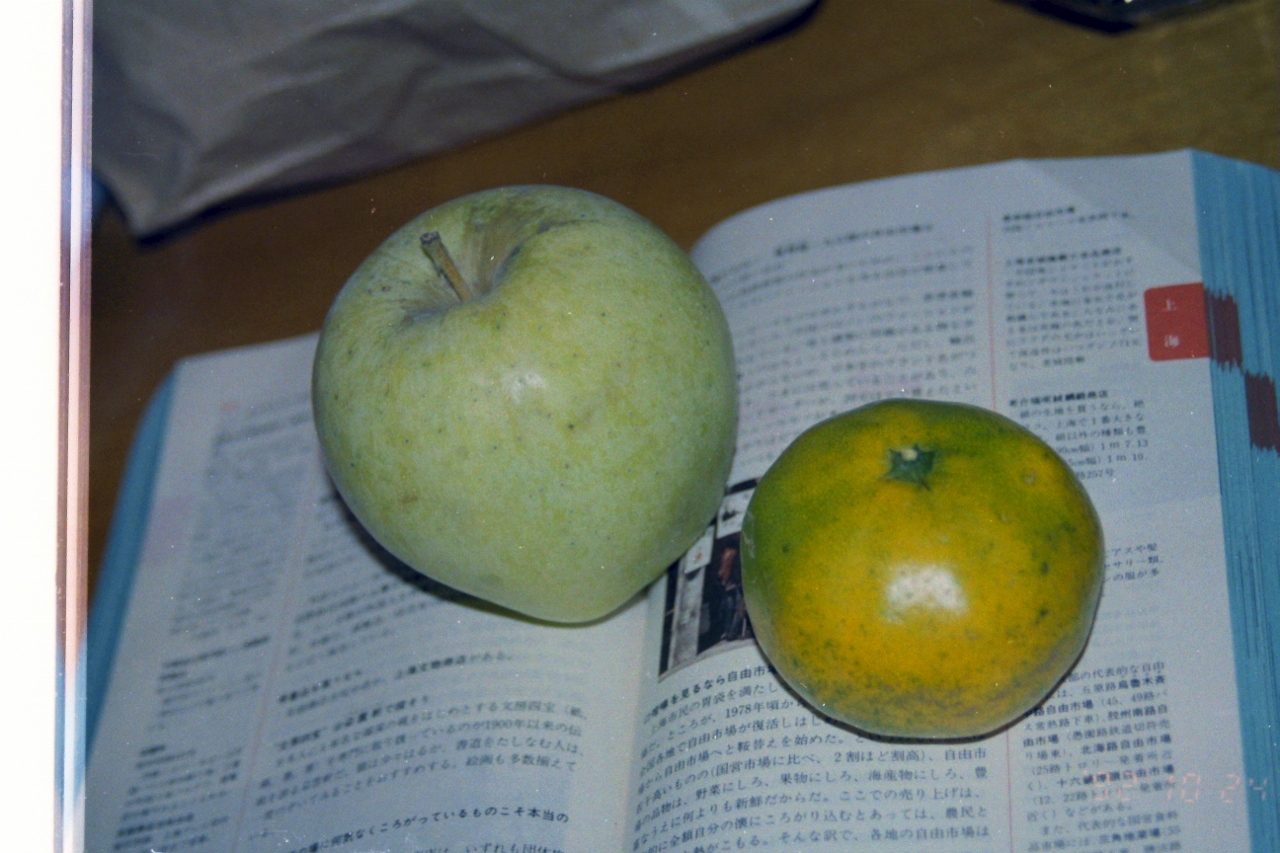 とりあえず、おそるおそるホテルを出て、探索。蘭州拉麺という、ラーメンの屋台みたいなのが見えます。でも、注文の仕方がわからないなぁ。雑貨屋があって、何かパンみたいなのを売ってるのも見えます。八百屋があった。果物なら買えそう!林檎とみかんを選んでおじさんに合図すると、値段を言ってくれました。適当に10元札を出すと、お釣りをくれました。買い物できた!