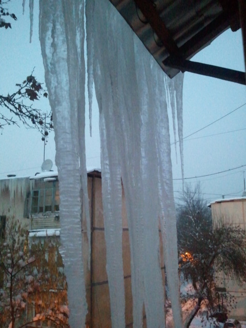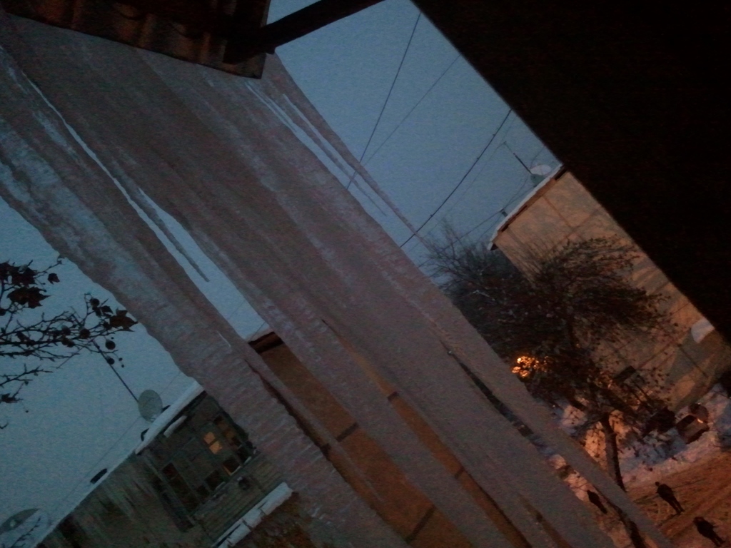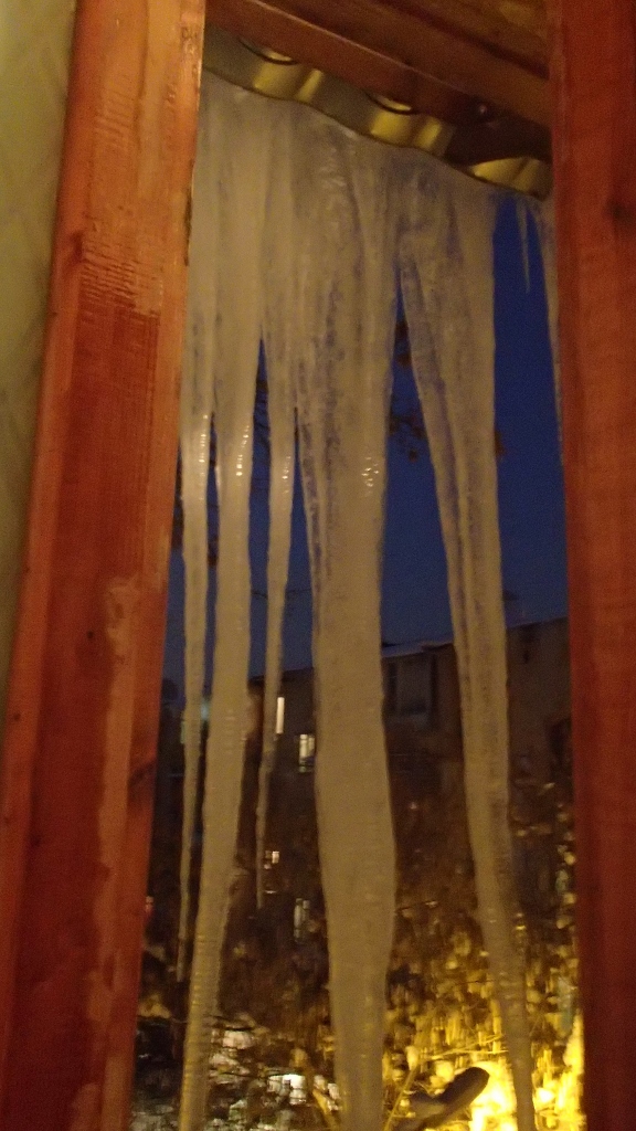 ツララ自体が大きすぎて、カメラに収まりきれない。だからサイズ感が伝わらないかも知れないけど、2m近い。うちの窓のひさしから下りたつららが、下の物干しから下りたつららに繋がっている。