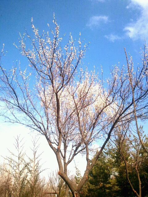 杏の花は、桜(ソメイヨシノ)と似ているけど、違うのは花の密度で、桜は、これでもか、と花が付いて、とても花の密度が高い感じだけれど、杏は、もっと間延びした感じに花がつくし、すぐに花びらも落ちてスカスカになるみたいです。