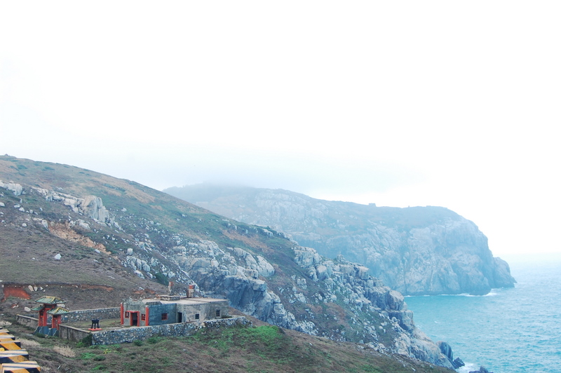島のくびれている部分で、両側に崖が迫っている場所に、朽ちた祠があって、その風景がとても良かったので、そこで暫く佇んで、写真を撮ったりしていた。車も人も通らないから、物音も無い。もしかしたら、視界にある軍の詰所に当番の兵隊がいるのかもしれないけれど、ここからでは少しもわからない。また歩き始めた。今日は、昨日と違って霧も出ていないし、時折晴れ間が覗くいい天気だった。灯台までの道も、道路に沿って行くのではなくて、わざと山を超えるルートを歩いてみた。これまで見たことのないような美しい風景。