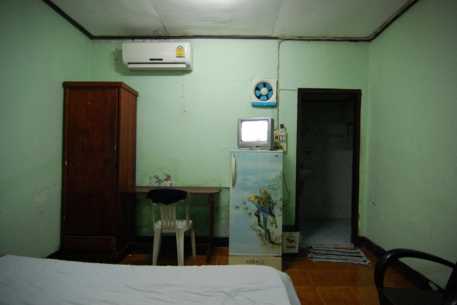 90,000キープ(約12ドル)で、昨日の宿より30,000キープ高いけど、エアコン、冷蔵庫、ワイファイ、テレビ(衛星放送、NHKワールド見られる)があり、部屋も広く、外にでればベンチでタバコを吸えるので、昨日の宿より10倍は居住性がいいです。あと、タイの携帯がそのまま使えるのも良い。