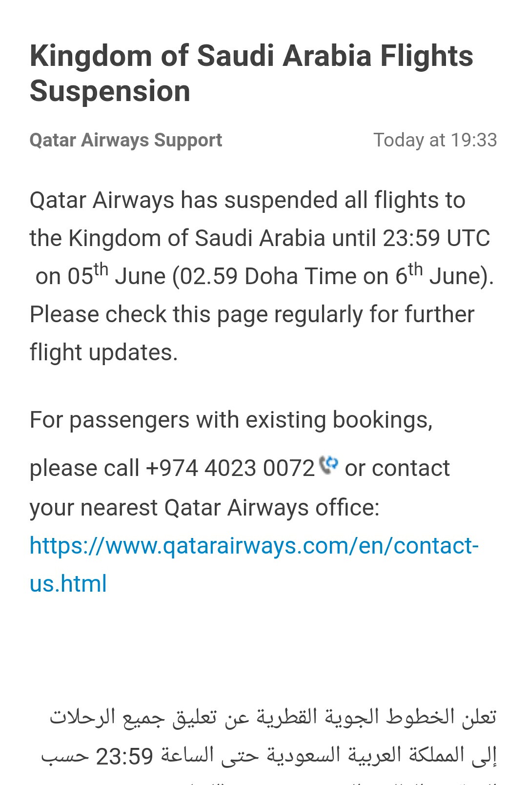 カタール航空英語版サイトのユーザーサポートでは、サウジアラビア便の運休に関してアナウンスされています。UTC 6月5日23:59までのサウジアラビア行き便を運休する、ということです。