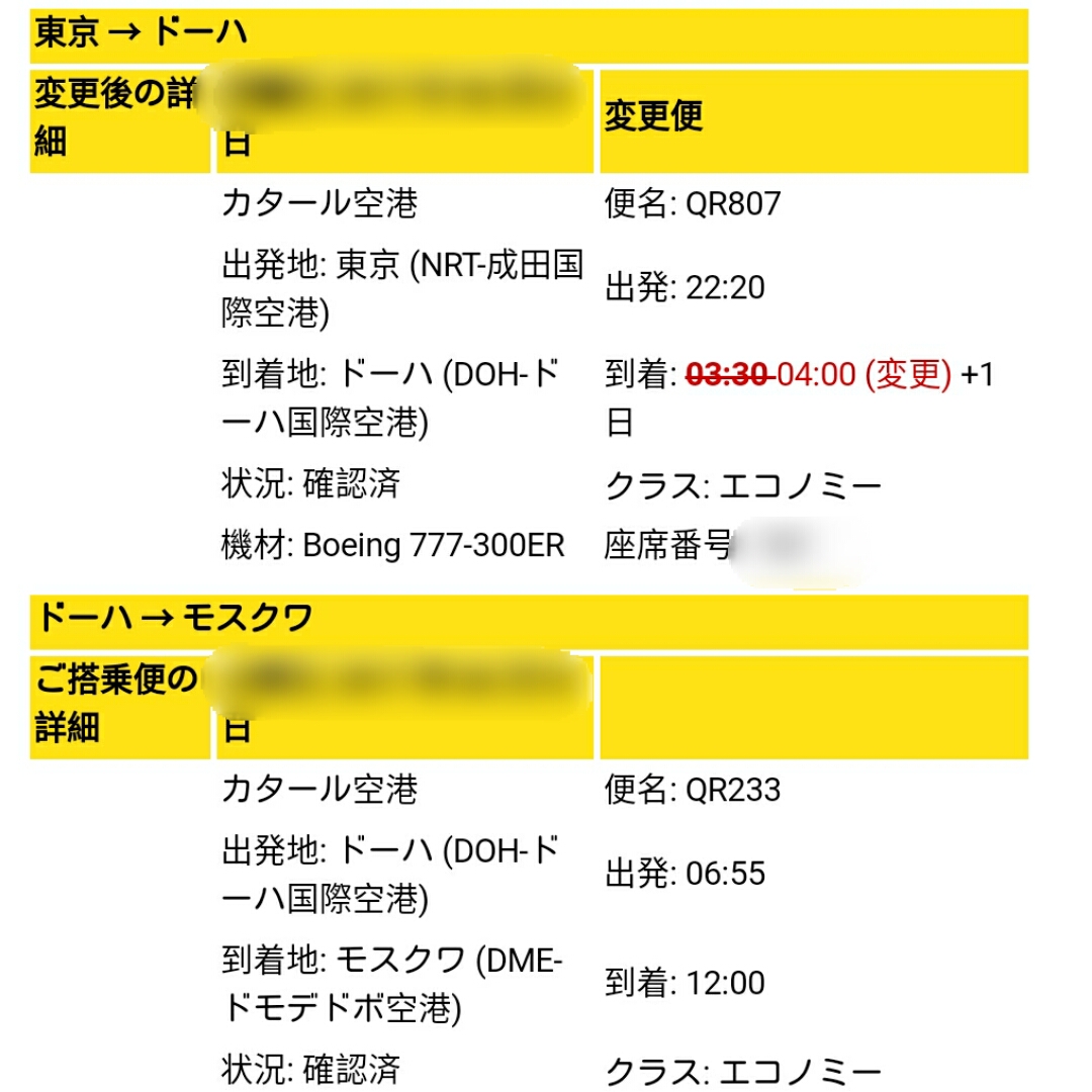 カタール航空から到着時刻変更の知らせがありました。成田ードーハのQR807便ですが、本来のドーハ着が3:30、30分遅れて4:00到着に変更とのこと。この便を使うのは4回目ですが、このような知らせは初めてのこと。