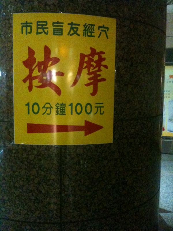 食事を終えて、地下街をぶらぶらと歩く。上海などに比べると、台北は同じく国際都市なんだろうけど、人ものんびりしてる。シューティングゲームとか、ダンスダンスレボリューションみたいなゲームをプレイしている大人が多いのが印象的だった。10分100元の按摩さんが出てたので、友達が施術されるのをぼんやりと眺めていた。客引きと客さばきをするのは健常者のおばさんで、5人くらいの按摩さんはみんな盲人だった。代金として貰ったお札を手で触って確かめているので、何か盲人向けのサインが紙幣に付いているみたい。