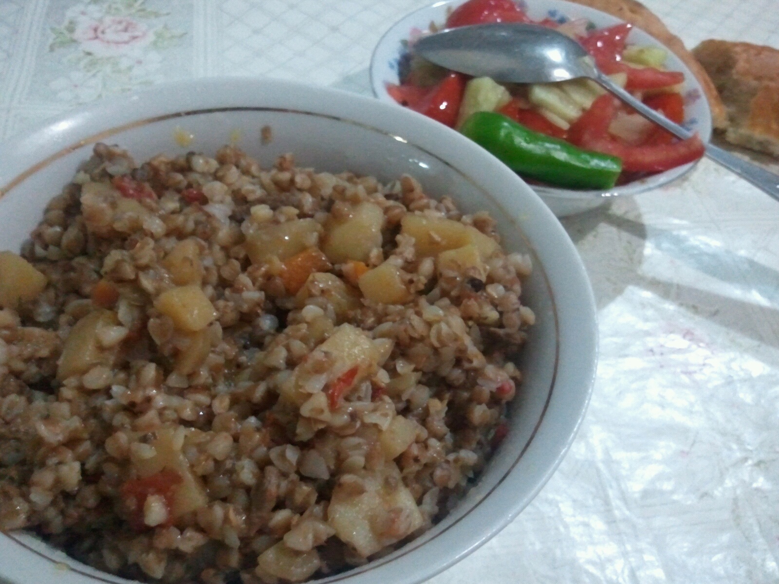 これは、グレチカといって、そばの実をそのまま使った料理。グレチカがそばの実を表すロシア語の単語です。肉やじゃがいもと一緒に油で炊いた感じに仕上がっています。こちらは、主食の種類が多くて、麺、マカロニ、パン、ご飯、そばの実が食べられています。