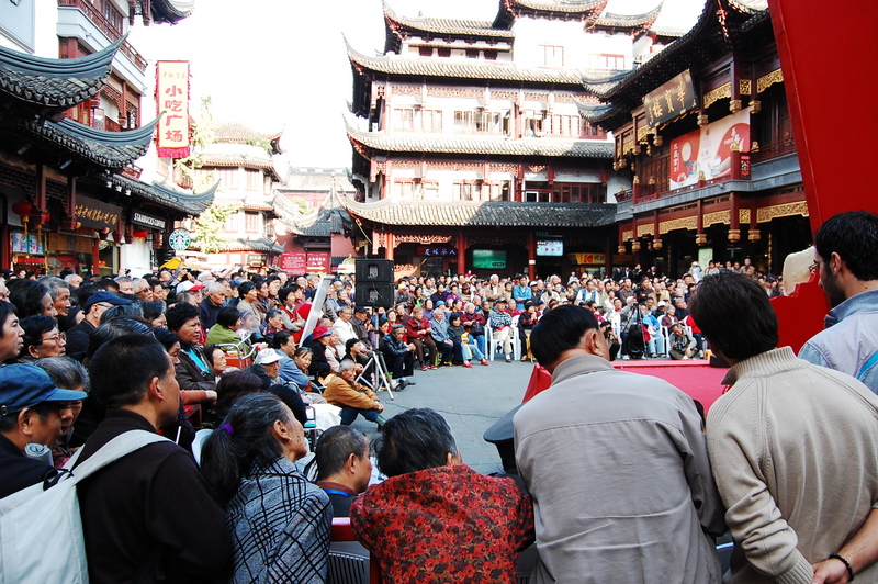 朝から天気の良かった日曜日。暖かそうなのでTシャツで外出した。今日は豫園にゆきます。上海といえば豫園。南京東路駅から10号線でひと駅乗る。それにしても、地上の景観をなるべく壊さないように地下に張り巡らした地下鉄網、事故があったりもするけれど、素晴らしいと思う。昔ながらの上海を壊さずに建設されたところが偉い。豫園の駅で降りたらすでにすごい人波。これはスリも怖いし、あまりのんびりできないのかも。豫園は主要な通りを通り過ぎただけで早々に退散した。青空京劇をやっていて老若男女が見入ってた風景だけは印象的だった。
