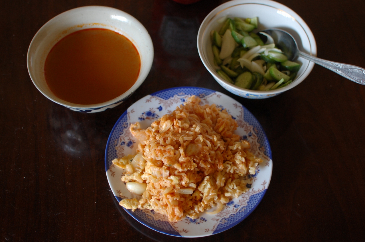 麺は湯きりしてしまって、たまねぎ、ニンニク、卵などと油でいためる。ケチャップと塩コショウで味付け。