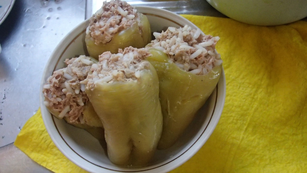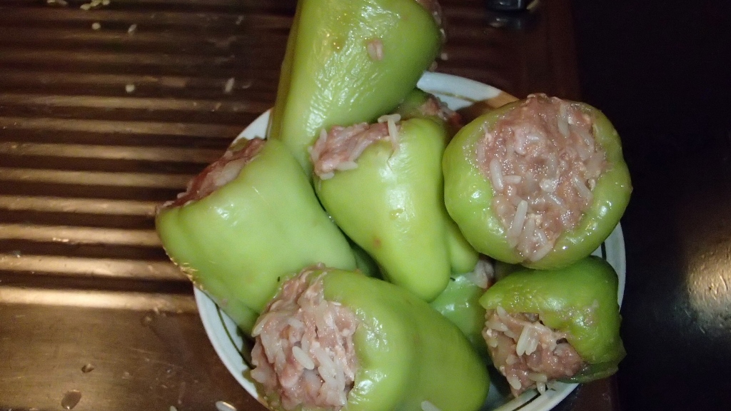 ピーマンの肉詰めを作りました。発祥はトルコ料理らしく、ウズベキスタンでは広く食べられています。ドルマという料理名だと思ってたんだけど、本来のドルマは葡萄の葉っぱでひき肉を包んで煮たもので、ピーマンの場合は、ブルガルスキーのドルマ?